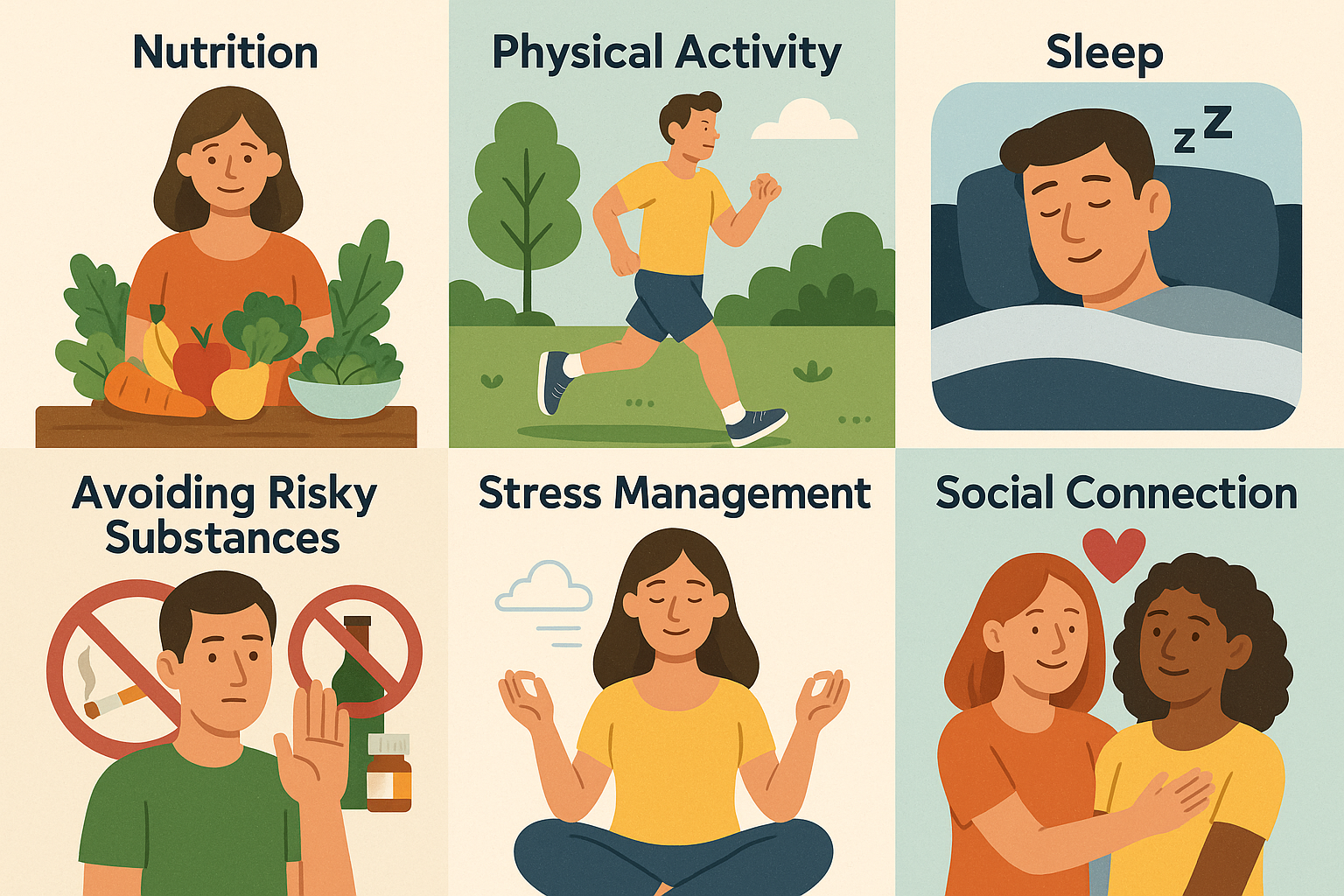 - 신체활동(Physical Activity): 규칙적인 운동과 일상에서의 신체활동을 통해 심혈관 건강을 증진하고, 비만 및 당뇨병과 같은 만성질환의 위험을 줄입니다. 운동은 정신 건강에도 긍정적인 영향을 미칩니다.